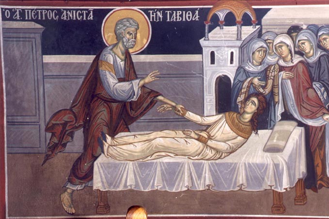 32 Now as Peter went here and there among them all, he came down also to the saints who lived at Lydda. 33 There he found a man named Aeneas, bedridden for eight years, who was paralyzed. 34 And Peter said to him, “Aeneas, Jesus Christ heals you; rise and make your bed.” And immediately he rose. 35 And all the residents of Lydda and Sharon saw him, and they turned to the Lord. 36 Now there was in Joppa a disciple named Tabitha, which, translated, means Dorcas. She was full of good works and acts of charity. 37 In those days she became ill and died, and when they had washed her, they laid her in an upper room. 38 Since Lydda was near Joppa, the disciples, hearing that Peter was there, sent two men to him, urging him, “Please come to us without delay.” 39 So Peter rose and went with them. And when he arrived, they took him to the upper room. All the widows stood beside him weeping and showing tunics and other garments that Dorcas made while she was with them. 40 But Peter put them all outside, and knelt down and prayed; and turning to the body he said, “Tabitha, arise.” And she opened her eyes, and when she saw Peter she sat up. 41 And he gave her his hand and raised her up. Then calling the saints and widows, he presented her alive. 42 And it became known throughout all Joppa, and many believed in the Lord. 43 And he stayed in Joppa for many days with one Simon, a tanner.