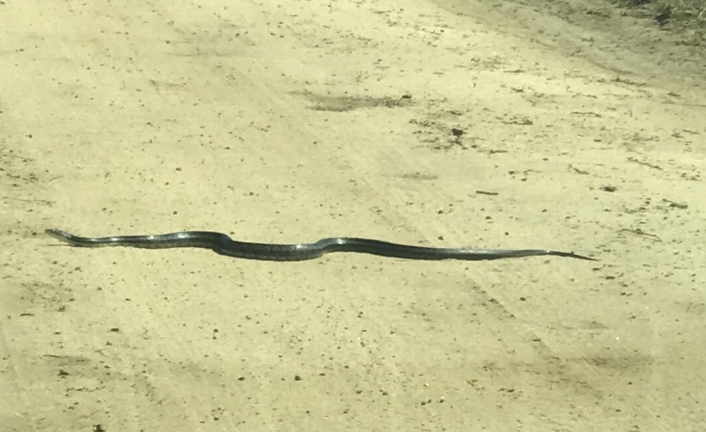 A few days ago my brother sent me a picture of a large snake slithering across the dirt rode down which he had been traveling. It appears to be a Kingsnake. My brother observed that he had stopped his car to watch the snake cross the road in front of him. I observed in reply that, if I were him, I would continue to watch the snake from inside the car!