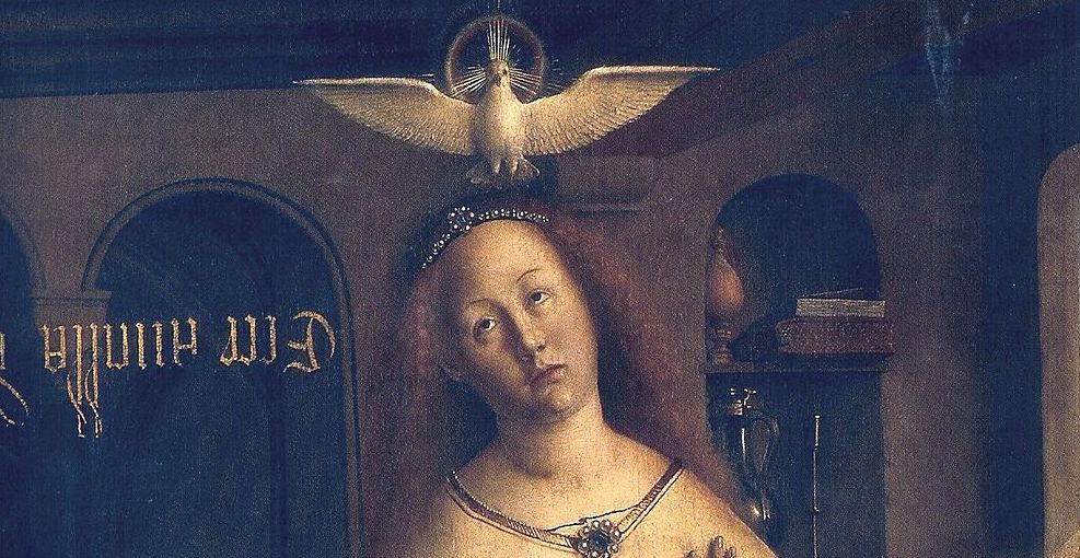 But there is a little detail that we dare not miss. In one of the panels we see the angel Gabriel. His words are written in Latin: AVE GRACIA PLENA D(OMI)N(U)S TECU(M) (“Hail who art full of grace, the Lord is with you”). And then, across the way, we see Mary and her response. She answers: ECCE ANCILLA D(OMI)NI (“Behold the handmaiden of the Lord”). But here is where the Van Eyck brothers do something brilliant.